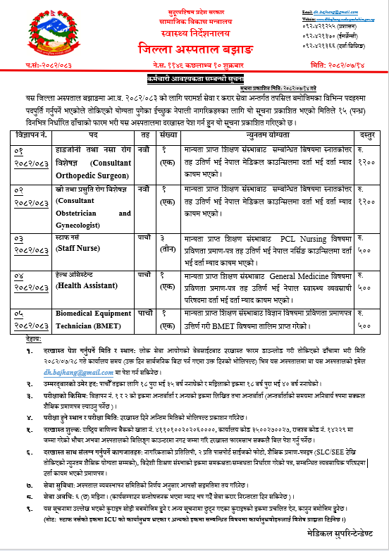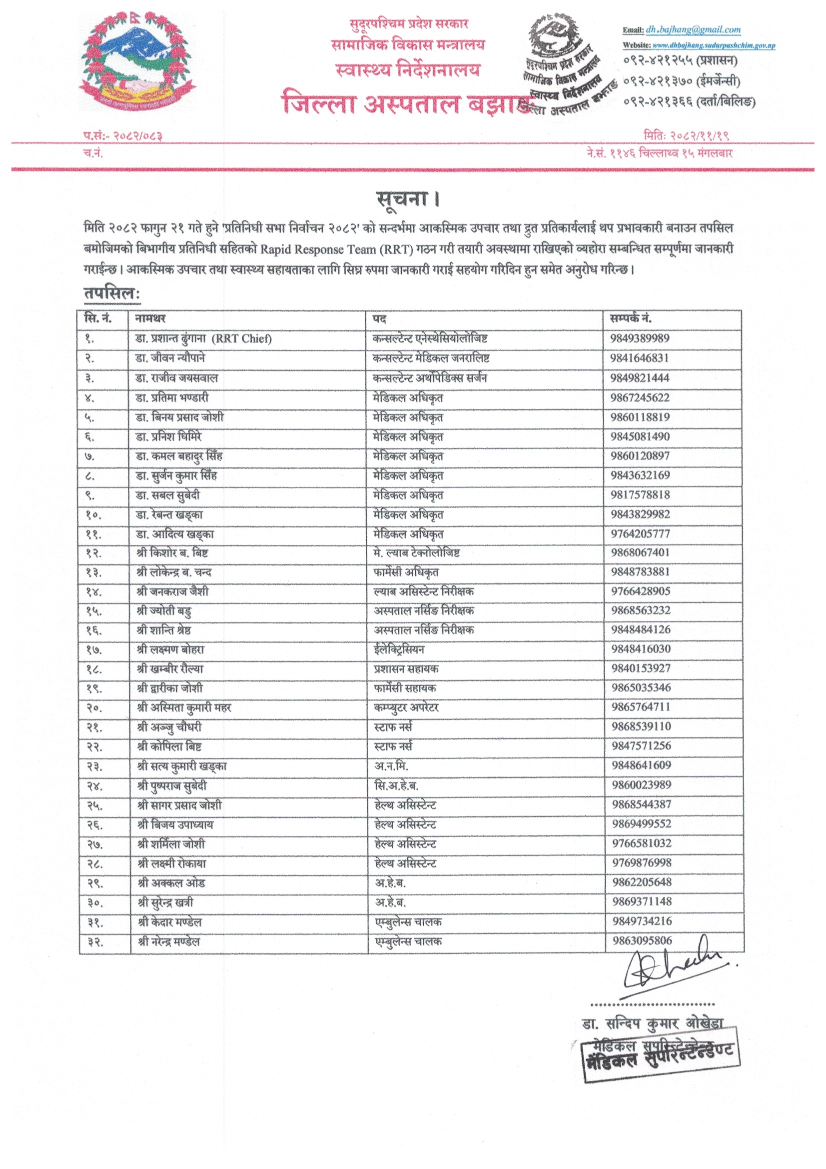 वि.सं. २०४४ सालमा स्थापना भएको सुदूरपश्चिम प्रदेश,सामाजिक विकास मन्त्रालय, स्वास्थ्य निर्देशनालय अन्तर्गत सञ्चालित जिल्ला अस्पताल बझाङ, जयपृथ्वी नगरपालिका वडा नं ९, बझाङमा स्वास्थ्य सेवाको आधारशिलाको रुपमा स्थापित प्रादेशिक अस्पताल हो । सुदूरपश्चिम प्रदेशको दुर्गम जिल्ला बझाङमा अवस्थित यस अस्पतालबाट स्वास्थ्य सेवा प्रवाहमा महत्वपुर्ण भुमिका निभाउदै आइरहेको छ । बझाङ जिल्लालगायत वरपरका समुदायहरुका लागि विशेषज्ञ सेवाहरुसहित विभिन्न चिकित्सकहरुद्वारा स्वास्थ्य सेवाहरु प्रवाह भइरहेको छ । यस जिल्ला अस्पतालबाट विशेष गरि ओपिडी सेवा, २४ सैं घण्टा ईमर्जेन्सी सेवा, डी.आर/सी.आर एक्स-रे सेवा, भिडियो एक्स-रे, प्रयोगशाला सेवा, खोप, फार्मेसी, प्रसुति सेवाहरु लगायत विभिन्न स्वास्थ्य सेवाहरू सहित सेवा प्रवाह भईरहेको छ । अस्पतालले उपचारमा मात्र ध्यान केन्द्रित गर्दैन तर रोकथाम हेरचाह, स्वास्थ्य शिक्षा,स्वास्थ्य जनचेतनामुलक र सामुदायिक आउटरिच कार्यक्रमहरूमा पनि जोड दिन्छ। यसले स्वास्थ्य र कल्याणको बिकनको रूपमा काम गर्दछ, यसले सेवा गर्ने मानिसहरूको लागि समग्र स्वास्थ्य परिणामहरू र जीवनको गुणस्तर सुधार गर्न प्रयास गर्दछ। जयपृथ्वी नगरपालिका, वडा नम्बर ९ मा रणनीतिक रूपमा अवस्थित, जिल्ला अस्पताल बझाङले... थप हेर्नुहोस
